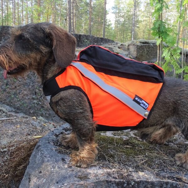 Flytevest – En sikkerhetsvest med ekstra flyteelementer som holder hunden flytende dersom den skulle falle i vannet. Denne vesten kombinerer synlighet og sikkerhet – ideell for jakt i nærheten av vann.
